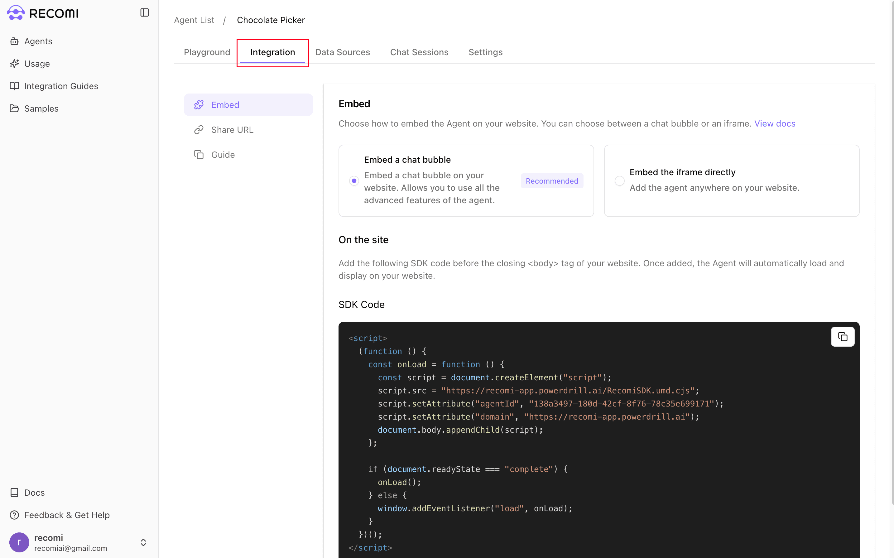 Click the Integration tab, select your preferred embedding method, and follow the guide to complete the integration.